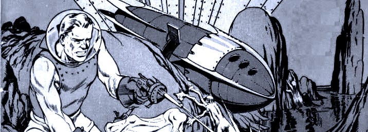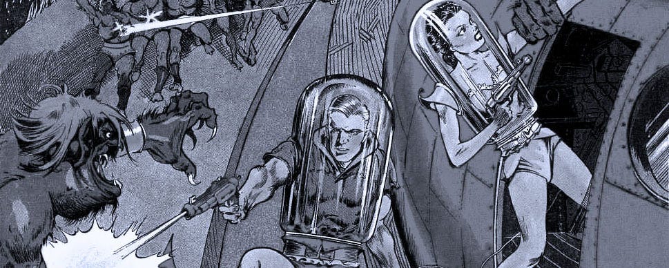 Suffice it to say that they have to contend with the Evil Overlord’s army of evil minions, the Fettermen. (Of course a merciless mogul who enslaves entire planets is going to name his enslaved, en-collared janissaries fettermen. After all, such an obvious plasma-pulpy name doesn’t require genius or even, say, a stroke of genius on the Emperor’s part.)
